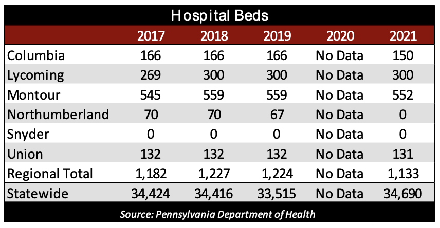 For those counties that have hospitals, the number of available beds has not declined significantly except for Northumberland County. While Montour County’s total of available hospital beds decreased by seven between 2019 and 2021, it continues to have the highest total in the region. Hospital bed data was unavailable in the 2020 Statewide Hospital Report.